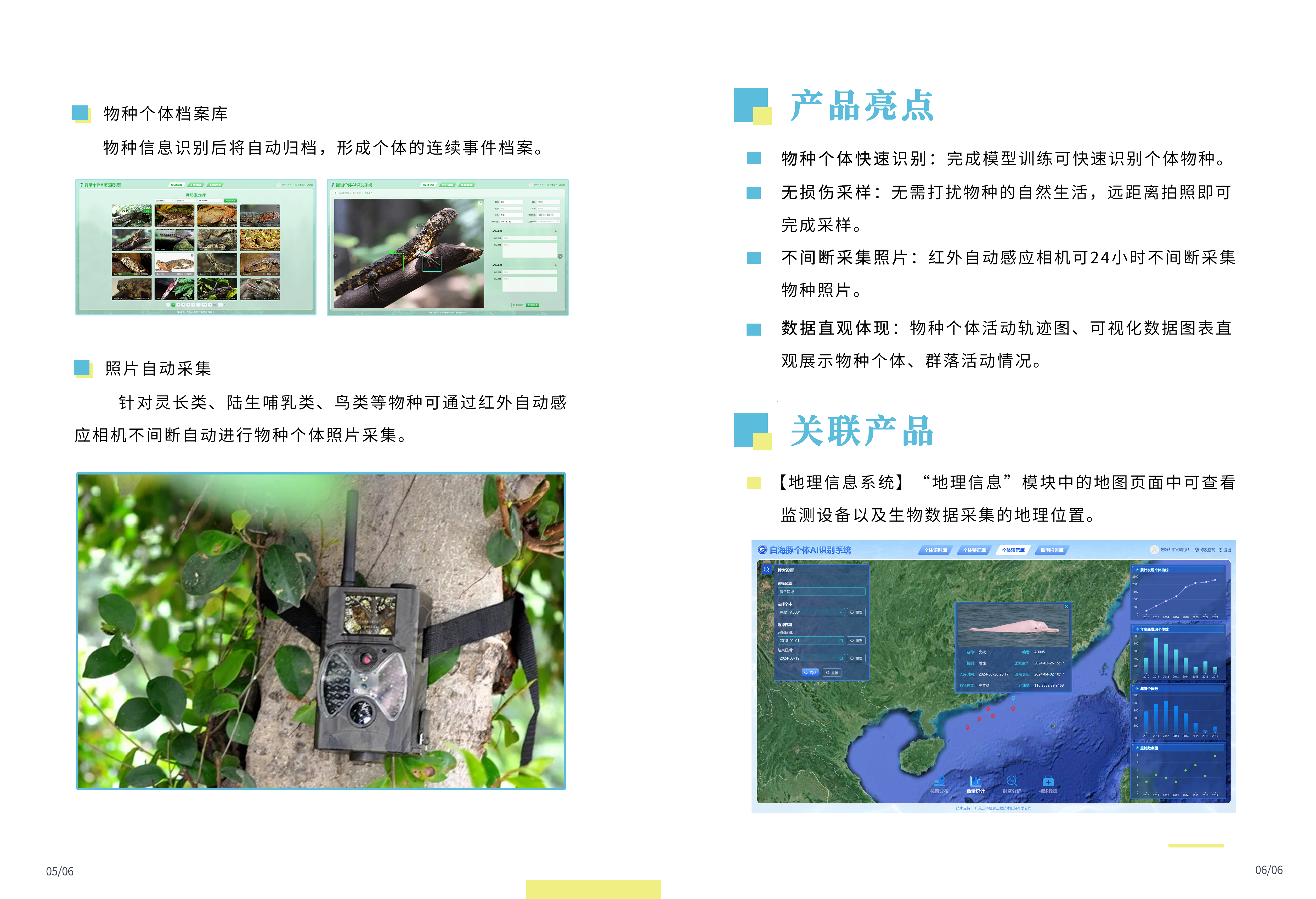 物种个体智能监测识别系统通过对卷积神经网络(CNN)等深度学习技术研发,针对指定物种的斑点、纹路、脸部等特征进行识别模型训练,实现了对物种个体的快速、精准识别。 结合三维地理信息系统可直观展示每个个体的活动轨迹,及群落繁衍情况,方便我们对珍稀物种进行保护、繁育和研究的精细化管理。